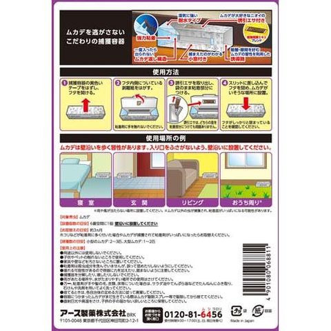 (使用場所の例)寝室・玄関・リビング・おうち周り(※雨や風が当たらない場所に設置してください。※ムカデ以外の虫が捕獲され、粘着面がいっぱいになる可能性があります。)