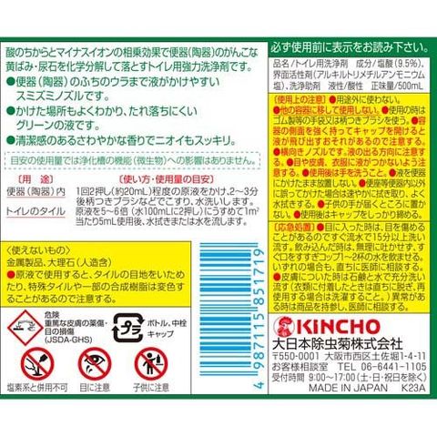 (使い方・使用量の目安)便器(陶器)内の場合:1回2押し(約20mL)程度の原液をかけ、2~3分後柄つきブラシなどでこすり、 水洗いします。トイレのタイルの場合:原液を5~6倍(水100mLに2押し)にうすめて1平方メートル当たり5mL使用後、水拭きまたは水を流します。