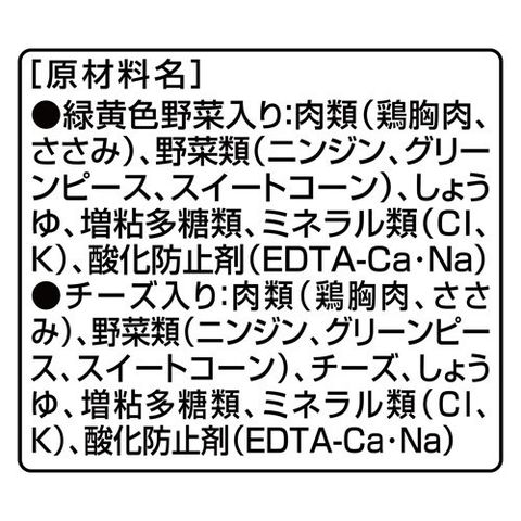 | ★緑黄色野菜入り:肉類(鶏胸肉、ささみ)、野菜類(ニンジン、グリーンピース、スイートコーン)、しょうゆ、増粘多糖類、ミネラル類(Cl、K)、酸化防止剤(EDTA-Ca・Na) ★チーズ入り:肉類(鶏胸肉、ささみ)、野菜類(ニンジン、グリーンピース、スイートコーン)、チーズ、しょうゆ、増粘多糖類、ミネラル類(Cl、K)、酸化防止剤(EDTA-Ca・Na) |