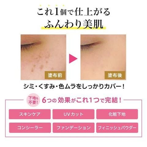 ●1個で6つの効果:スキンケア・UVカット・化粧下地・コンシーラー・ファンデーション・フィニッシュパウダー。