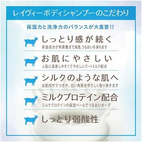 ●レイヴィーボディシャンプーシリーズの中でも人気の、ヤギ乳配合弱酸性ボディソープ。