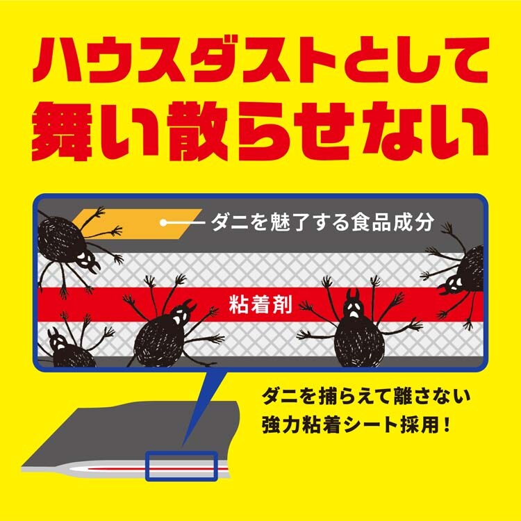 ●置くだけ簡単、捕獲したダニごと捨てられます。まくら、クッションなどに使いやすいシートがダニをしっかり捕獲。ダニを逃がさず、ハウスダストとして舞い散らせません。
