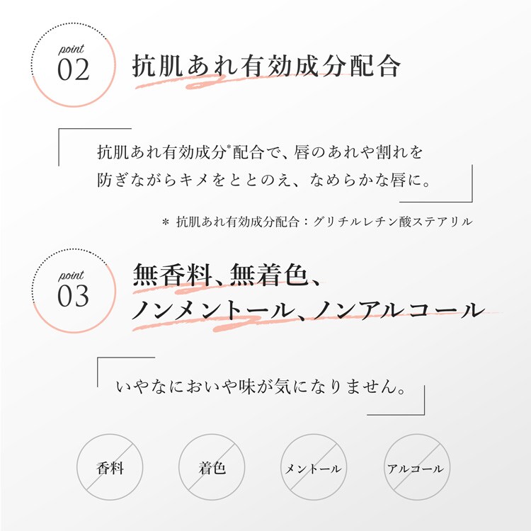 グリチルリチン酸ステアリル配合。唇のあれ・ひび割れを防ぎながらキメをととのえ、なめらかなくちびるに。