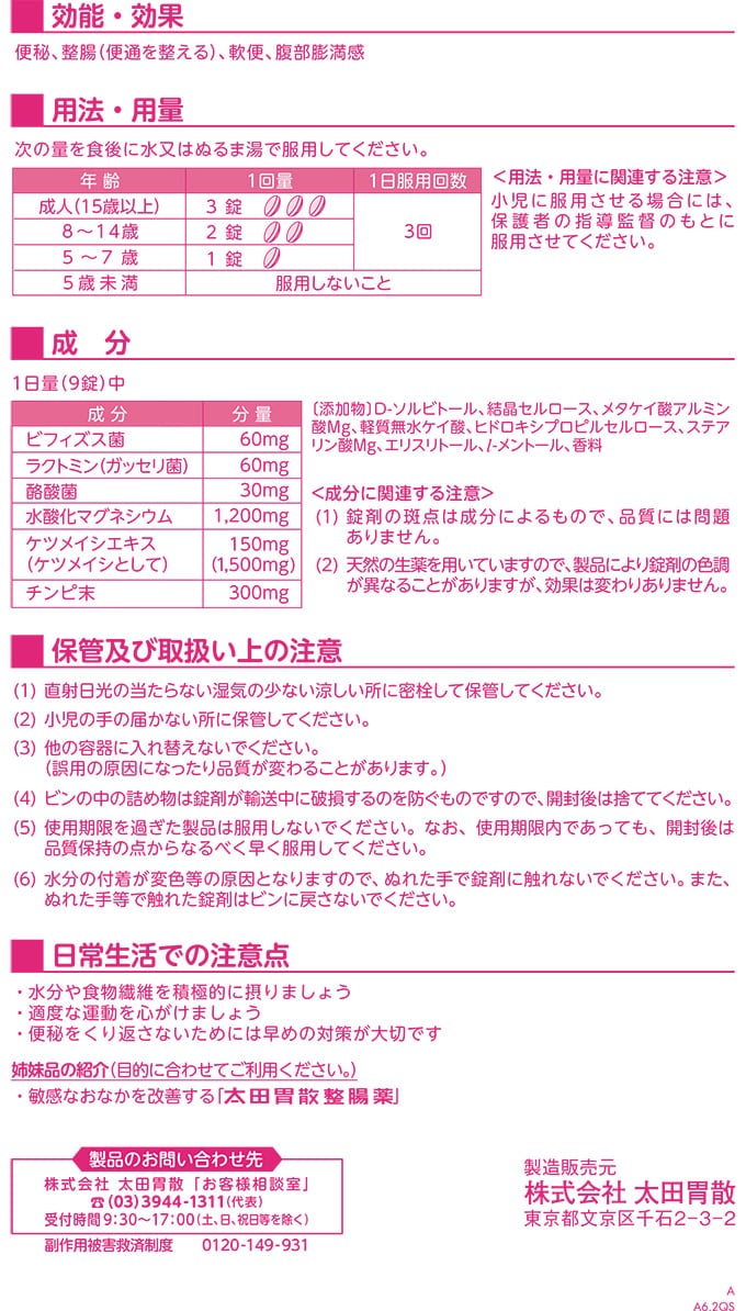 | 1日量(9錠)中 ビフィズス菌:60mg ラクトミン(ガッセリ菌):60mg 酪酸菌:30mg 水酸化マグネシウム:1200mg ケツメイシエキス(ケツメイシとして):150mg(1500mg) チンピ末:300mg 添加物:D-ソルビトール、結晶セルロース、メタケイ酸アルミン酸Mg、軽質無水ケイ酸、ヒドロキシプロピルセルロース、ステアリン酸Mg、エリスリトール、l‐メントール、香料 ★成分に関連する注意 (1)錠剤の斑点は成分によるもので、品質には問題ありません。 (2)天然の生薬を用いていますので、製品により錠剤の色調が異なることがありますが、効果は変わりありません。 |