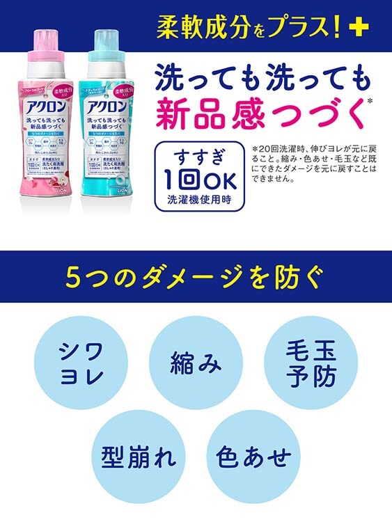 ●すすぎ1回OKだから、もっとダメージ防げる。洗っても洗っても新品感続く※1、柔軟成分入りおしゃれ着用洗剤。