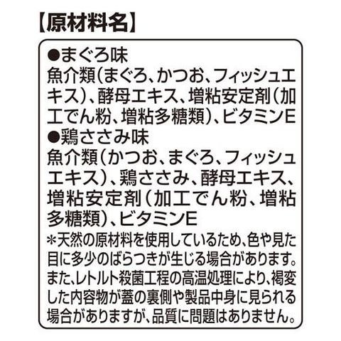 | ★まぐろ味 魚介類(まぐろ、かつお、フィッシュエキス)、酵母エキス、増粘安定剤(加工でん粉、増粘多糖類)、ビタミンE ★鶏ささみ味 魚介類(かつお、まぐろ、フィッシュエキス)、鶏ささみ、酵母エキス、増粘安定剤(加工でん粉、増粘多糖類)、ビタミンE ※天然の原材料を使用しているため、色や見た目に多少のばらつきが生じる場合があります。また、レトルト殺菌工程の高温処理により、褐変した内容物が蓋の裏側や製品中身に見られる場合がありますが、品質に問題はありません。 |