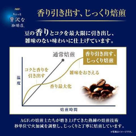 ●香り引き出す、じっくり焙煎。「ちょっと贅沢な珈琲店」レギュラー・コーヒーは、厳選した豆の特徴に合わせて、AGF独自の「香り引き出す、じっくり焙煎」技術により、丁寧に焙煎した豊かなコクと深く濃い香り。珈琲店のマスターがハンドドリップで淹れたような贅を尽くした奥深い味わいと香りが楽しめるレギュラーコーヒーです。