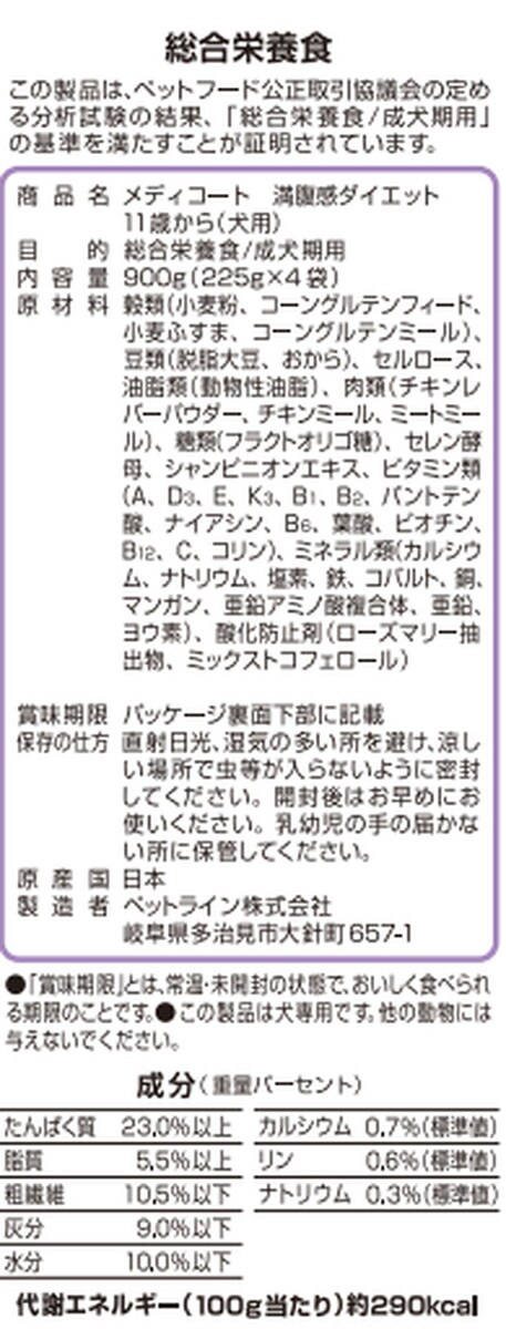 | たんぱく質:23%以上、脂質:5.5%以上、粗繊維:10.5%以下、灰分:9%以下、水分:10%以下、カロリー約290kcal/100g |
