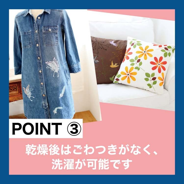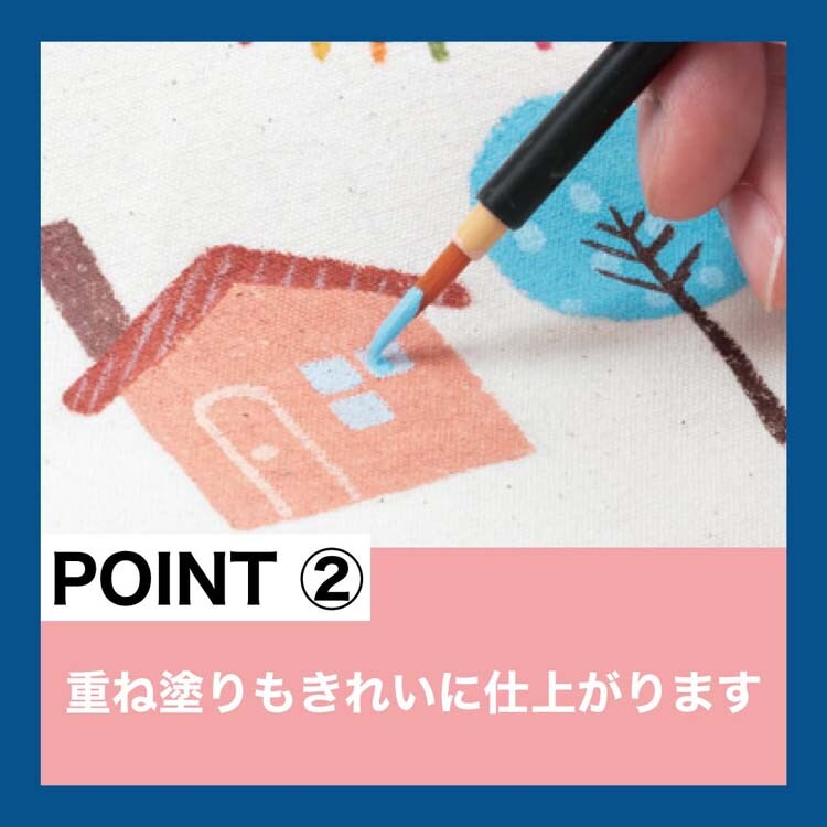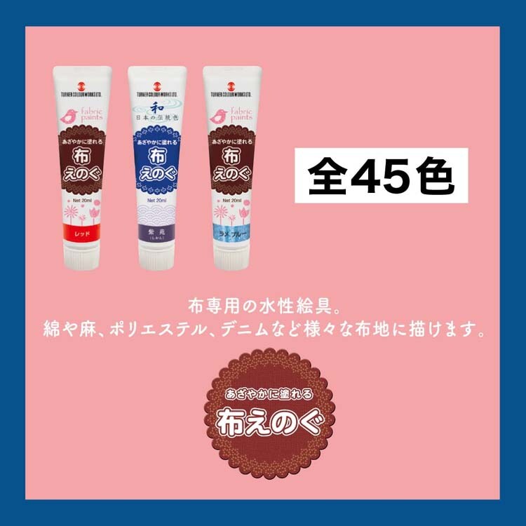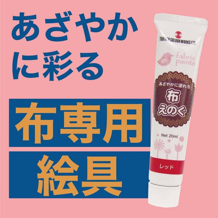 <機能>生地の特徴を最大限に利用した楽しい作品作りの世界が広がります。アイロンでの熱処理は不要です。綿や麻、ポリエステル、デニムなどさまざまな布地に描けます。塗り面積は布の種類によって違いますが、20mLチューブ1本で、A4サイズ1枚を塗ることができます。乾燥後はゴワつきがなく、洗濯が可能です。