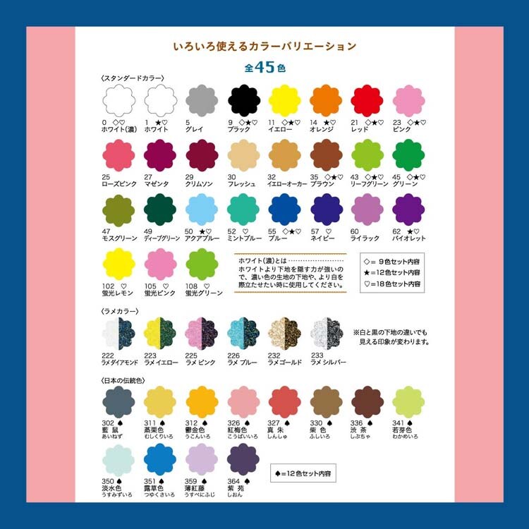 ・濃い色の生地に塗る時は、下地にホワイト(濃)を塗ってから描いてください。