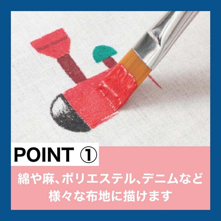 布専用の水性絵具です。アイロンでの熱処理は不要で、乾燥後はゴワつきが少なく水に強いため、洗濯しても色落ちしません。さまざまな生地に描け、しっかりと接着し、きれいに発色します。
