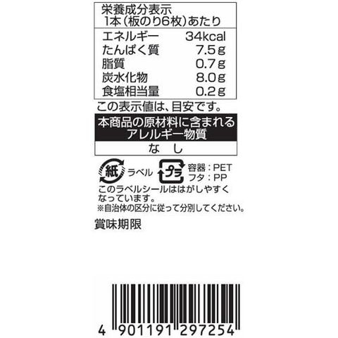 | (1本(板のり6枚)あたり) エネルギー:34kcal たんぱく質:7.5g 脂質:0.7g 炭水化物:8.0g 食塩相当量:0.2g |