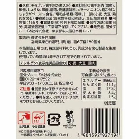 | 鶏手羽肉(国産)、砂糖、しょうゆ、黒酢、清酒、発酵調味料、ソテーオニオン、塩こうじ、しょうがペースト、食塩/増粘多糖類、酒精、(一部に小麦・大豆・鶏肉を含む) |