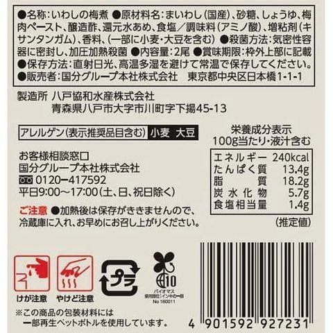 | まいわし(国産)、砂糖、しょうゆ、梅肉ペースト、醸造酢、還元水あめ、食塩/調味料(アミノ酸)、増粘剤(キサンタンガム)、香料、(一部に小麦・大豆を含む) |