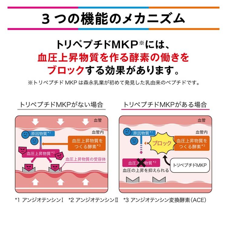届出表示:本品にはカゼインペプチド(トリペプチドMKPとして)と難消化性デキストリン(食物繊維)が含まれます。カゼインペプチド(トリペプチドMKPとして)には、高めの血圧(収縮期血圧)を下げる機能、難消化性デキストリン(食物繊維)には、食後の血糖値や血中中性脂肪の上昇をおだやかにする機能が報告されています。