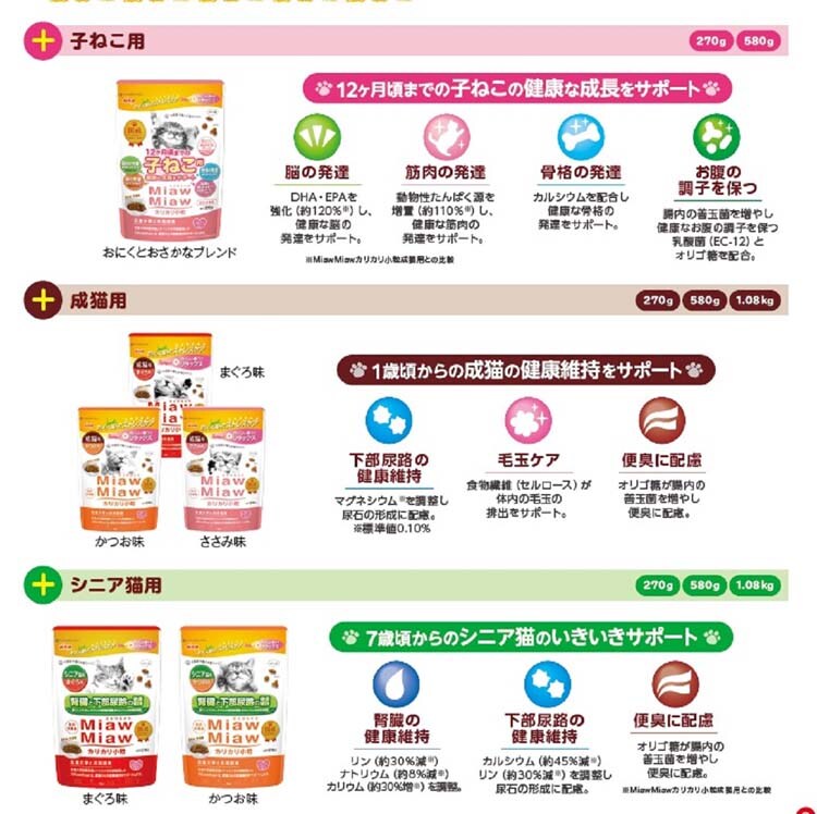 ・初めて『MiawMiaw』を与える場合は、今までの食事に少量ずつ混ぜ、徐々に量を増やしながら、1週間程度で切り替えてください。