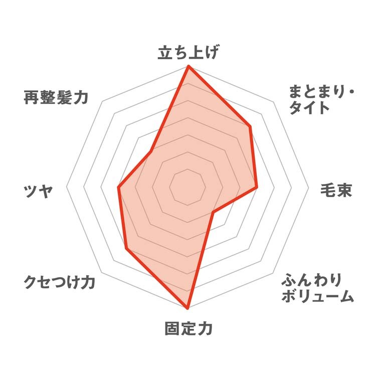(1)極強の立ち上げ力:セット成分*1を大量に配合しているので、前髪やトップが強烈に立ち上がる。