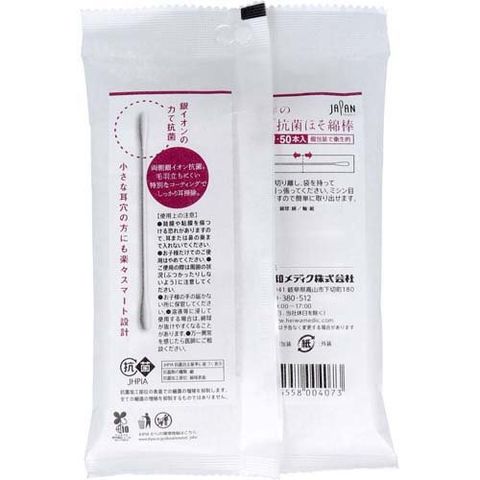 | ・個装重量:約14g ・内容量:50本入 ・JHPIA抗菌自主基準に基づく表示 抗菌剤の種類:銀 抗菌加工部位:綿球表面 ※抗菌加工部位の表面での細菌の増殖を抑制します。全ての細菌の増殖を抑制するものではありません。 |