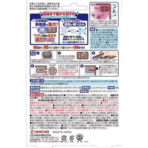 ●メッシュの中に薬剤が練りこんであり、約366日間効果を発揮。アミ戸への虫の付着やアミ戸の目を通過しよう とする小さな虫の侵入を防ぐためにご使用ください。