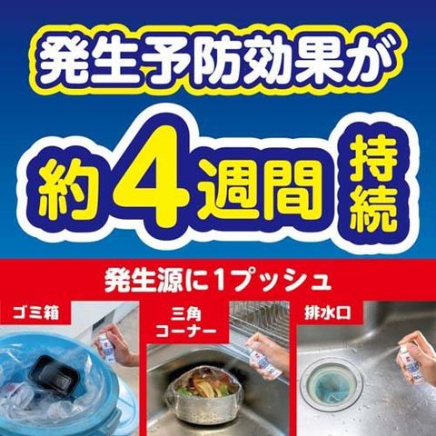 ・コバエが集まりやすい場所(ゴミ箱、生ゴミなど)にあらかじめ噴射しておくと、コバエの発生を予防します。