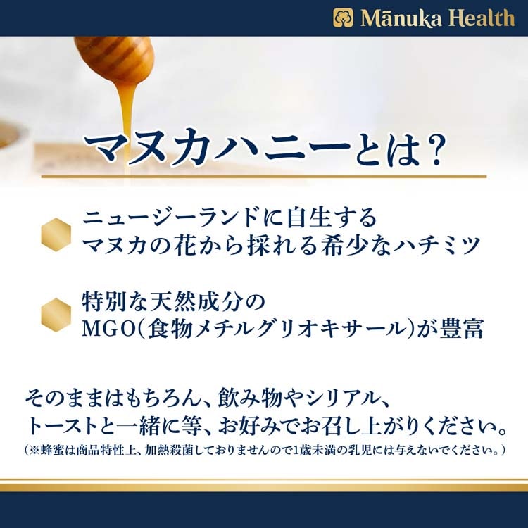 「MGO400+」はマヌカヘルスのマヌカハニーシリーズの中でも高いグレードに相当します。
