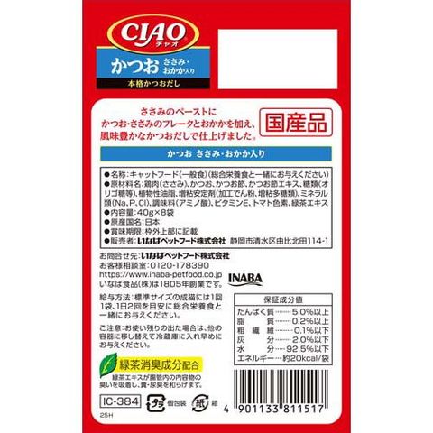 | 鶏肉(ささみ)、かつお、かつお節、かつお節エキス、糖類(オリゴ糖等)、植物性油脂、増粘安定剤(加工でん粉、増粘多糖類)、ミネラル類(Na、P、Cl)、調味料(アミノ酸)、ビタミンE、トマト色素、緑茶エキス |