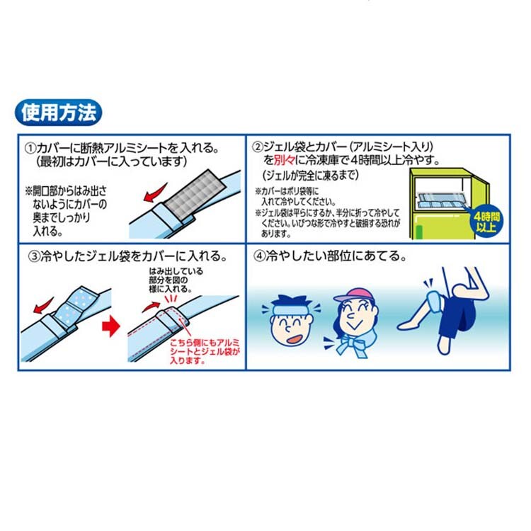 ※ジェル袋は平らにするか、半分に折って冷やしてください。いびつな形で冷やすと破損する恐れがあります。