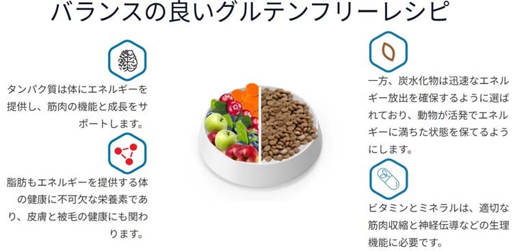 鶏肉(45%)(内80%乾燥鶏肉、20%新鮮骨抜き鶏肉)、米、トウモロコシ、鶏脂肪、エンドウ豆デンプン、鶏レバー、ニシン油、エンドウ豆繊維、チコリ根、乾燥ビール酵母、乾燥フルーツと野菜(ブルーベリー0.4%、クランベリー0.4%、リンゴ0.2%、人参0.2%)、炭酸カルシウム、ユッカジュース