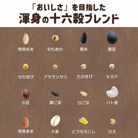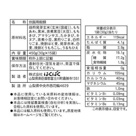 | 焙煎発芽玄米(玄米(国産))、もちあわ、黒米、蒸煮黒豆(大豆)、もちきび、アマランサス、たかきび、キヌア、蒸煮小豆、黒煎りごま、白煎りごま、挽割はと麦、発芽赤米、白麦、挽割とうもろこし、うるちひえ |