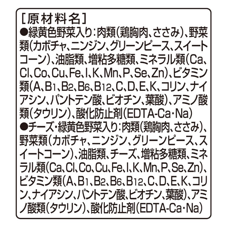 | ★緑黄色野菜入り 肉類(鶏胸肉、ささみ)、野菜類(カボチャ、ニンジン、グリーンピース、スイートコーン)、油脂類、増粘多糖類、ミネラル類(Ca、Cl、Co、Cu、Fe、l、K、Mn、P、Se、Zn)、ビタミン類(A、B1、B2、B6、B12、C、D、E、K、コリン、ナイアシン、パントテン酸、ビオチン、葉酸)、アミノ酸類(タウリン)、酸化防止剤(EDTA-Ca・Na) ★チーズ・緑黄色野菜入り 肉類(鶏胸肉、ささみ)、野菜類(カボチャ、ニンジン、グリーンピース、スイートコーン)、油脂類、チーズ、増粘多糖類、ミネラル類(Ca、Cl、Co、Cu、Fe、l、K、Mn、P、Se、Zn)、ビタミン類(A、B1、B2、B6、B12、C、D、E、K、コリン、ナイアシン、パントテン酸、ビオチン、葉酸)、アミノ酸類(タウリン)、酸化防止剤(EDTA-Ca・Na) |