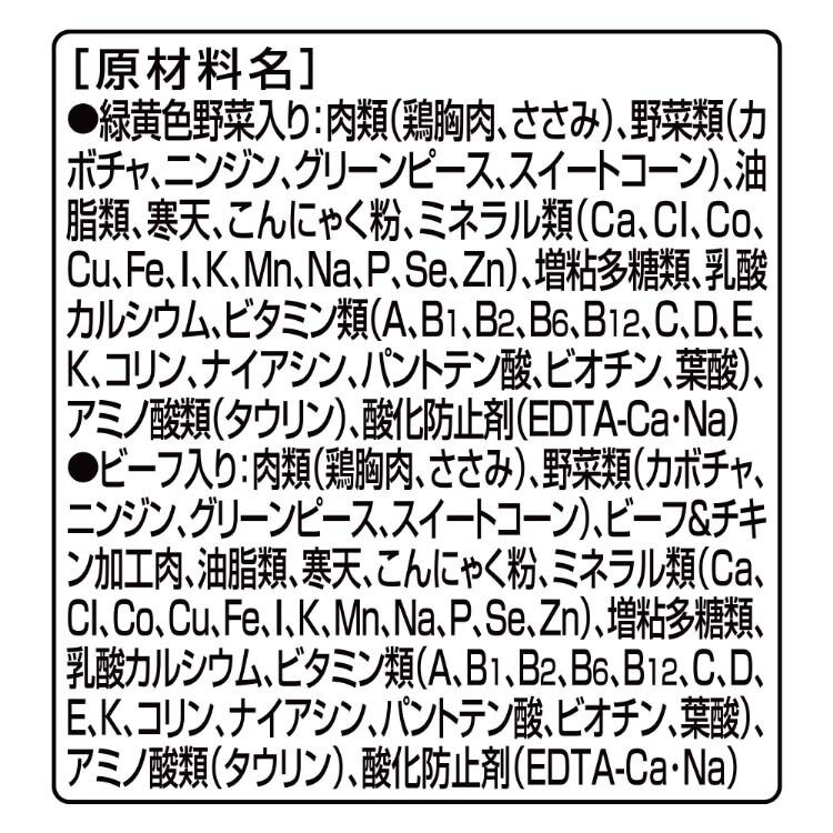 ★ビーフ入り:肉類(鶏胸肉、ささみ)、野菜類(カボチャ、ニンジン、グリーンピース、スイートコーン)、ビーフ&チキン加工肉、油脂類、寒天、こんにゃく粉、ミネラル類(Ca、Cl、Co、Cu、Fe、I、K、Mn、Na、P、Se、Zn)、増粘多糖類、乳酸カルシウム、ビタミン類(A、B1、B2、B6、B12、C、D、E、K、コリン、ナイアシン、パントテン酸、ビオチン、葉酸)、アミノ酸類(タウリン)、酸化防止剤(EDTA-Ca・Na)