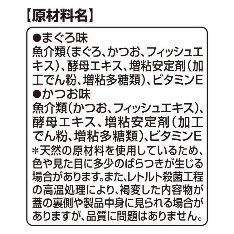| ★まぐろ味 魚介類(まぐろ、かつお、フィッシュエキス)、酵母エキス、増粘安定剤(加工でん粉、増粘多糖類)、ビタミンE ★かつお味 魚介類(かつお、フィッシュエキス)、酵母エキス、増粘安定剤(加工でん粉、増粘多糖類)、ビタミンE ※天然の原材料を使用しているため、色や見た目に多少のばらつきが生じる場合があります。また、レトルト殺菌工程の高温処理により、褐変した内容物が蓋の裏側や製品中身に見られる場合がありますが、品質に問題はありません。 |