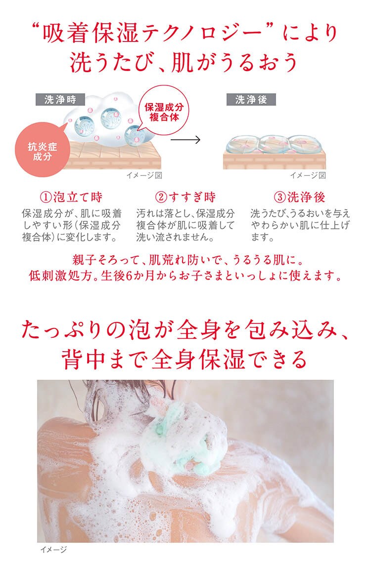 ●吸着保湿テクノロジーで保湿成分が洗い流されないので、高い保湿効果。洗うたび全身にうるおいを与え、忙しいママも、洗うだけで全身うるうる肌に。