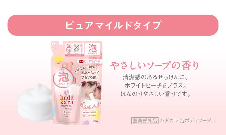●1プッシュでたっぷりのなめらか泡が出てくる「ハダカラ泡ボディソープ」の、小さい子どもとママが一緒に使える「薬用ピュアマイルドタイプ」。