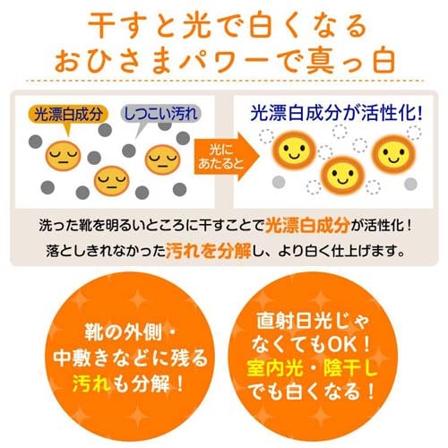 ●光り漂白成分が、明るいところに干すことによりしつこい汚れとニオイを分解します。光り漂白剤は、汚れやシミの色素を分解するので、色柄物のくつにもご使用いただけます。光り漂白の効果は、光りがあたった瞬間から始まるので、くつが乾燥するまで干しておけば充分な効果が得られます。陰干しを前提に処方設計をしており、天日干し、陰干し、室内光でも光り漂白の効果に変わりはありません。
