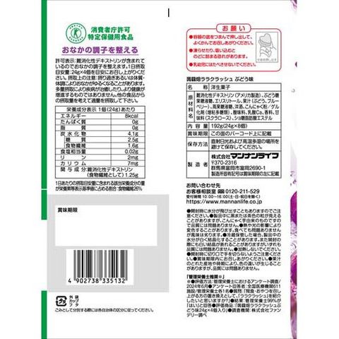 難消化性デキストリン(アメリカ製造)、ぶどう糖果糖液糖、エリスリトール、果汁(ぶどう、ブルーベリー)、高果糖液糖、洋酒、こんにゃく粉/ゲル化剤(増粘多糖類)、酸味料、乳酸Ca、香料、甘味料(スクラロース)、ショ糖脂肪酸エステル