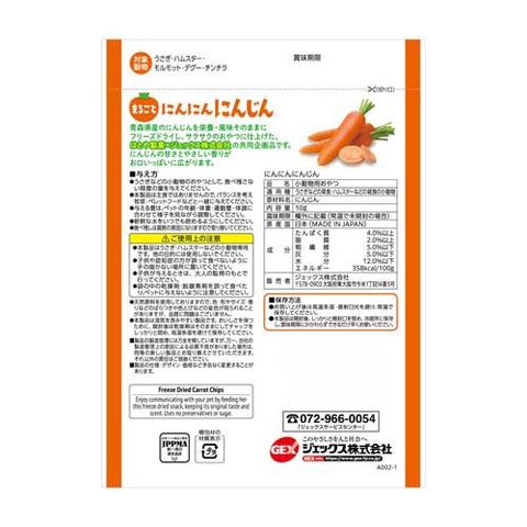 | 粗たんぱく質・・・4.0%以上 粗脂肪・・・2.0%以上 粗繊維・・・5.0%以下 粗灰分・・・5.0%以下 水分・・・12.0%以下 エネルギー・・・358kcaL(100gあたり) (1袋10gあたり約36kcaL) |