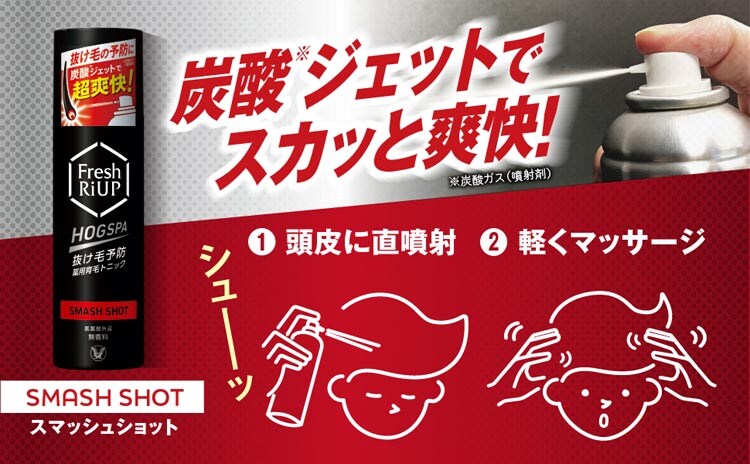 ●「フレッシュリアップ HOGSPA スマッシュショット」は、手軽にスカッと育毛したい方に炭酸※ジェットが超爽快を演出します。