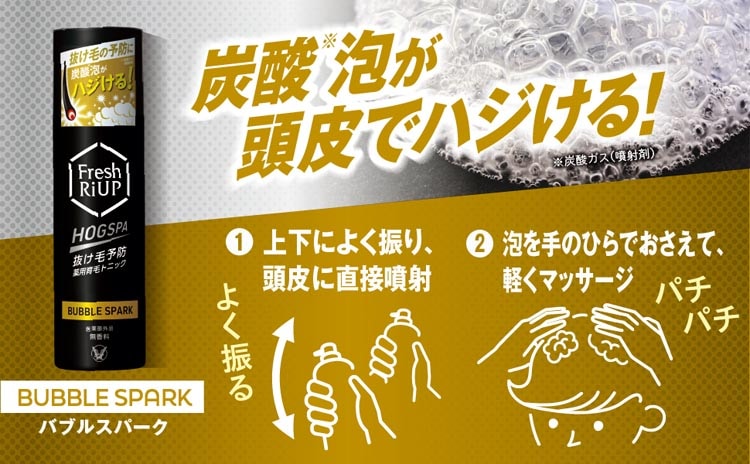 ●「フレッシュリアップ HOGSPA バブルスパーク」は、ていねいに育毛をしたい方に炭酸※泡が頭皮でパチパチとハジける感覚を演出します。