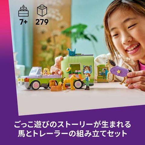 ●楽しいごっこ遊びセット:レゴ フレンズ 馬の親子とトレーラー(42695)は、ミニドールフィギュア2体、車とトレーラー、馬、子馬、子犬、カエルのフィギュアが付属し、お子さまの想像力を刺激する楽しい組み立てセットです
