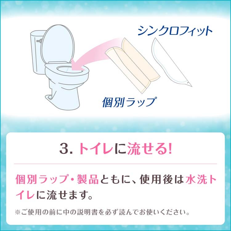 ・トイレのつまりを防ぐため、シンクロフィットは1枚ずつ大の水流で流してください。