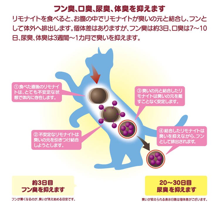 ●フン臭は3日程度、尿臭は3週間~1カ月で軽減をサポートします。(個体差はあります)