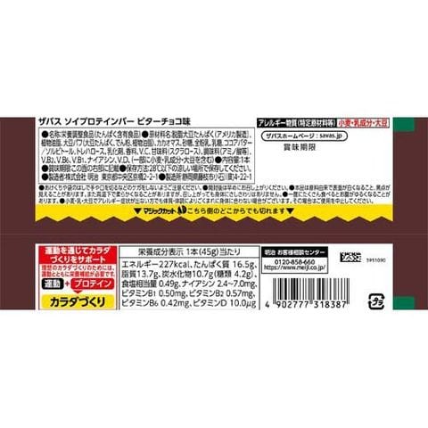 ●1本(45g)あたり、たんぱく質を15g配合、227kcal。糖類30%オフ(「ザバスプロテインバーチョコレート味」比)