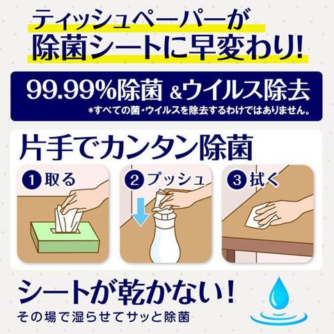 キッチンペーパー、ティッシュ、乾いた布などをポンプ上部に押し当ててプッシュし(目安:一回あたり1プッシュ)、除菌したい部分を拭く。その後の二度拭きや洗い流しは不要。
