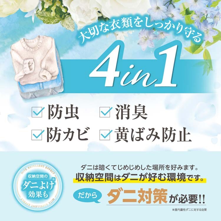 ●せんいの防虫に加え、気になるダニを収納空間内に寄せつけにくくします。(ピレスロイドの効果)