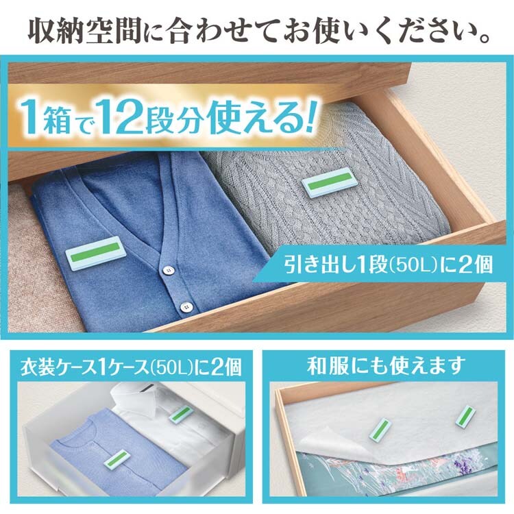 ●消臭成分配合。収納空間の気になるニオイ※を消臭します。(※気になるニオイ=カビ臭・汗臭・体臭)