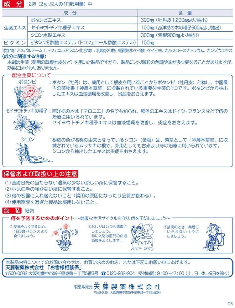 | 2包(2g:成人の1日服用量)中 成分:含量 生薬エキス:ボタンピエキス:300mg(牡丹皮1200mgより抽出) 生薬エキス:セイヨウトチノキ種子エキス:100mg(西洋栃の木の種子600mgより抽出) 生薬エキス:シコン水製エキス:300mg(紫根900mgより抽出) ビタミン:ビタミンE酢酸エステル(トコフェロール酢酸エステル):100mg 添加物:アスパルテーム(L-フェニルアラニン化合物)、乳糖水和物、軽質無水ケイ酸、ケイヒ末、カルメロースナトリウム、カンゾウエキス ★成分に関連する注意 本剤は生薬(薬用の草根木皮など)を用いた製品ですから、製品により顆粒の色調や味が多少異なることがありますが、効果にはかわりありません。 ★配合生薬について ボタンピ:ボタン(牡丹)は、薬用として根皮を用いることからボタンピ(牡丹皮)と称し、中国最古の薬物書「神農本草経」に収載されている重要な生薬の1つです。 ボタンピから抽出したエキスは血液循環を改善し、炎症をおさえます。 セイヨウトチノキの種子:西洋栃の木は「マロニエ」の名でも知られ、種子のエキスはドイツ・フランスなどで痔の治療に用いられています。 セイヨウトチノキ種子エキスは血液循環を改善し、炎症をおさえます。 シコン:根皮の色が名称の由来となっているシコン(紫根)は、紫草として「神農本草経」に収載されているムラサキの根で、外用としても古来より痔の治療に用いられています。 シコンから抽出したエキスは炎症をおさえます。 |