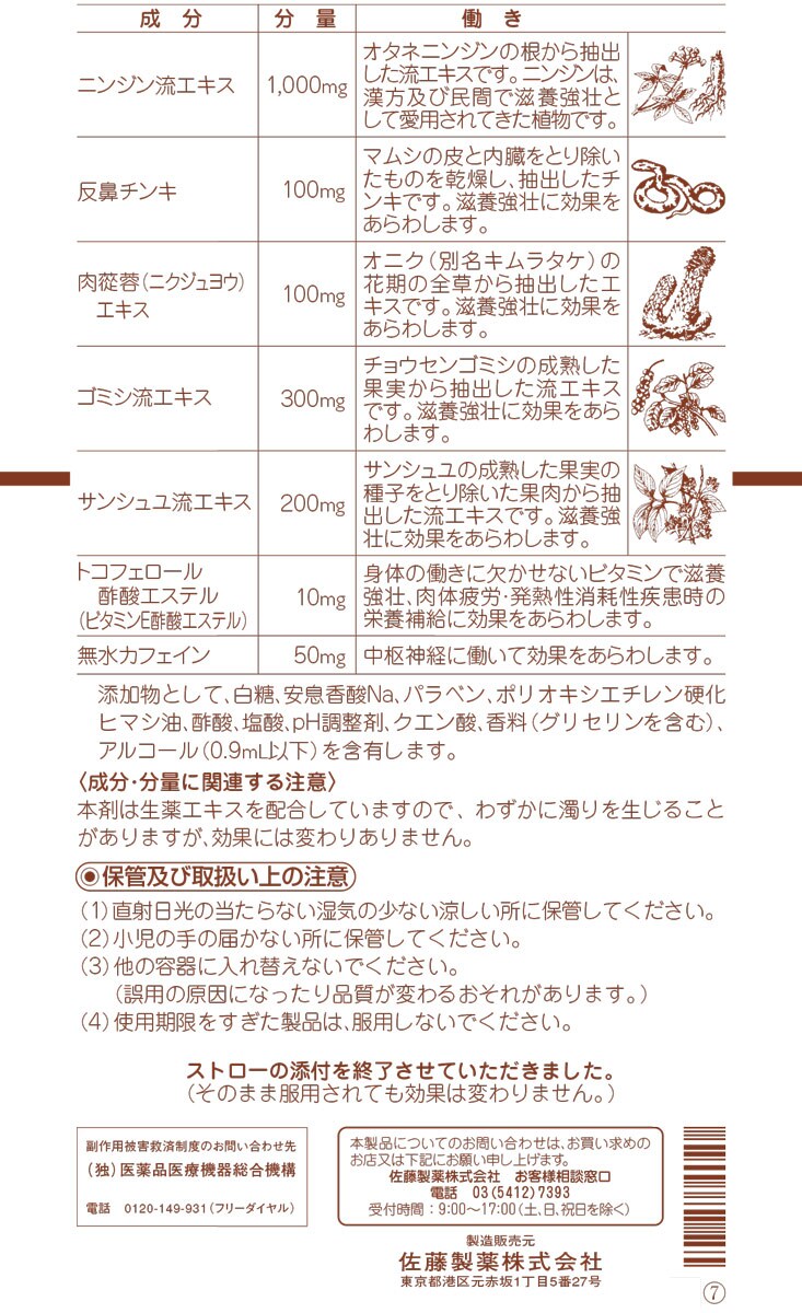 | (成分分量)1瓶(30ml)中 イカリソウ流エキス:1000mg ニンジン流エキス:1000mg 反鼻チンキ:100mg 肉じゅ蓉(ニクジュヨウ)エキス:100mg ゴミシ流エキス:300mg サンシュユ流エキス:200mg トコフェロール酢酸エステル(ビタミンE酢酸エステル):10mg 無水カフェイン:50mg 添加物として、白糖、安息香酸Na、パラベン、ポリオキシエチレン硬化ヒマシ油、酢酸、塩酸、pH調整剤、クエン酸、香料(グリセリンを含む)、アルコール(0.9ml以下)を含有します。 (成分・分量に関連する注意) 本剤は生薬エキスを配合していますので、わずかに濁りを生じることがありますが、効果には変わりありません。 |