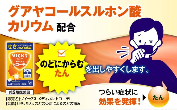 ●ヴイックス メディカル トローチLは、殺菌・消毒作用のあるセチルピリジニウム塩化物水和物、せきを鎮めるフェノールフタリン酸デキストロメトルファン、たんを出しやすくするグアヤコールスルホン酸カリウムを配合した鎮咳去痰薬です。