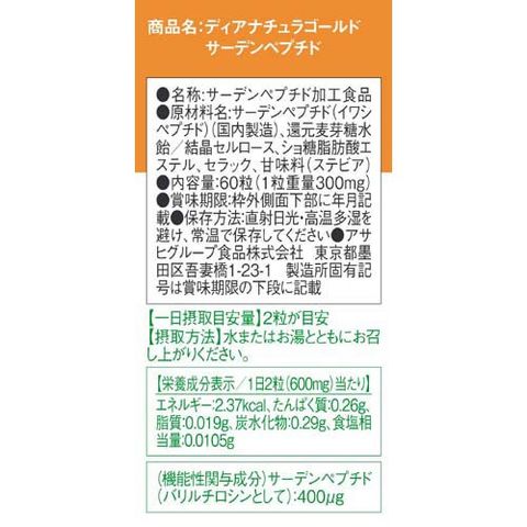 | 1日2粒(600mg)当たり エネルギー:2.37kcal、たんぱく質:0.26g、脂質:0.019g、炭水化物:0.29g、食塩相当量:0.0105g (機能性関与成分)サーデンペプチド(バリルチロシンとして) :400μg |